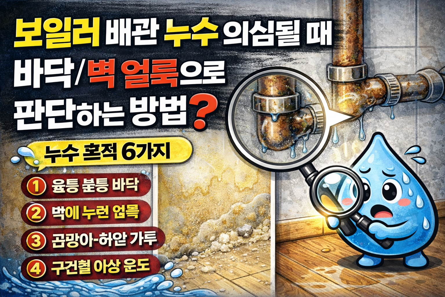 수도요금이 늘었는데 변기·싱크대·샤워기에서 딱히 이상을 못 찾았다면, 다음으로 많이 놓치는 구간이 보일러 주변 배관입니다. 특히 온수 사용이 늘지 않았는데도 요금이 오른 경우, “눈에 띄지 않는 미세 누수”가 집 안 마감재에 흔적을 남기는 경우가 있어요. 오늘은 공구 없이도 가능한 바닥·벽 얼룩으로 누수 의심을 좁히는 법을 정리합니다.